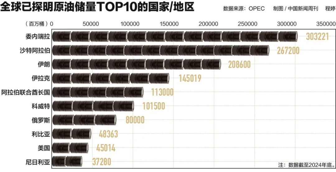 委内瑞拉的石油行业似乎充满矛盾,其原油储量全球第一,截至2024年年底,已探明储量在3000亿桶以上,占比全球近20%,位列沙特之前。但是委内瑞拉原油产量与出口量在全球原油产量与贸易量中的占比仅约1%,使得其对国际石油市场的影响微乎其微。